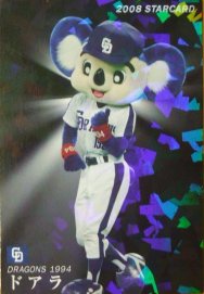 このスターカードは出現率の低いスペシャルカードで、各球団2選手が収録されている。プロ野球チームは12球団なので、全24種類。その球団のトップクラスの2選手がカード化されるのだが、中日ドラゴンズの2選手に投手の「川上憲伸」と「ドアラ」が選ばれているのだ。